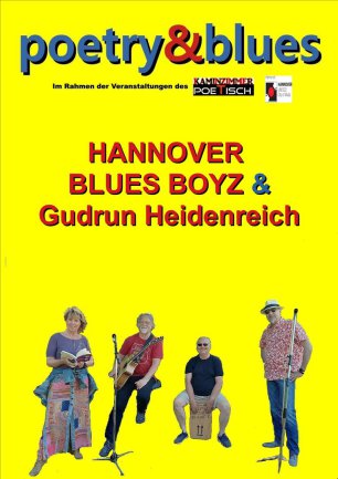 Begleitet wird sie von den HANNOVER BLUES BOYZ (Jürgen Diercks, Martin Kinkel und Thomas Holzapfel). Sie sorgen für den richtigen Groove zu den Texten und runden das Konzept Lesung/Musik mit hervorragenden Songs aus der Blueskiste ab. Die drei Musiker verführen das Publikum in die Welt des sanften Blues und sorgen dadurch für eine ganz besondere Stimmung. Die Kombination von lässig interpretierter Bluesmusik und Gudruns schrägen Wortbeiträgen wird den Novemberblues mal außen vor lassen.